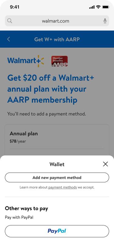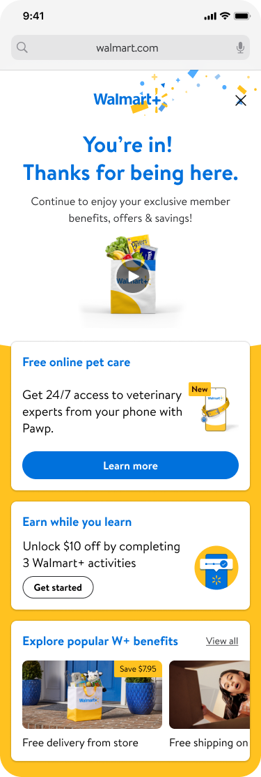 Existing Walmart+ member — streamlined conversion from monthly or annual plan to the discounted partner rate. Minimises friction for members who are already invested in Walmart+.