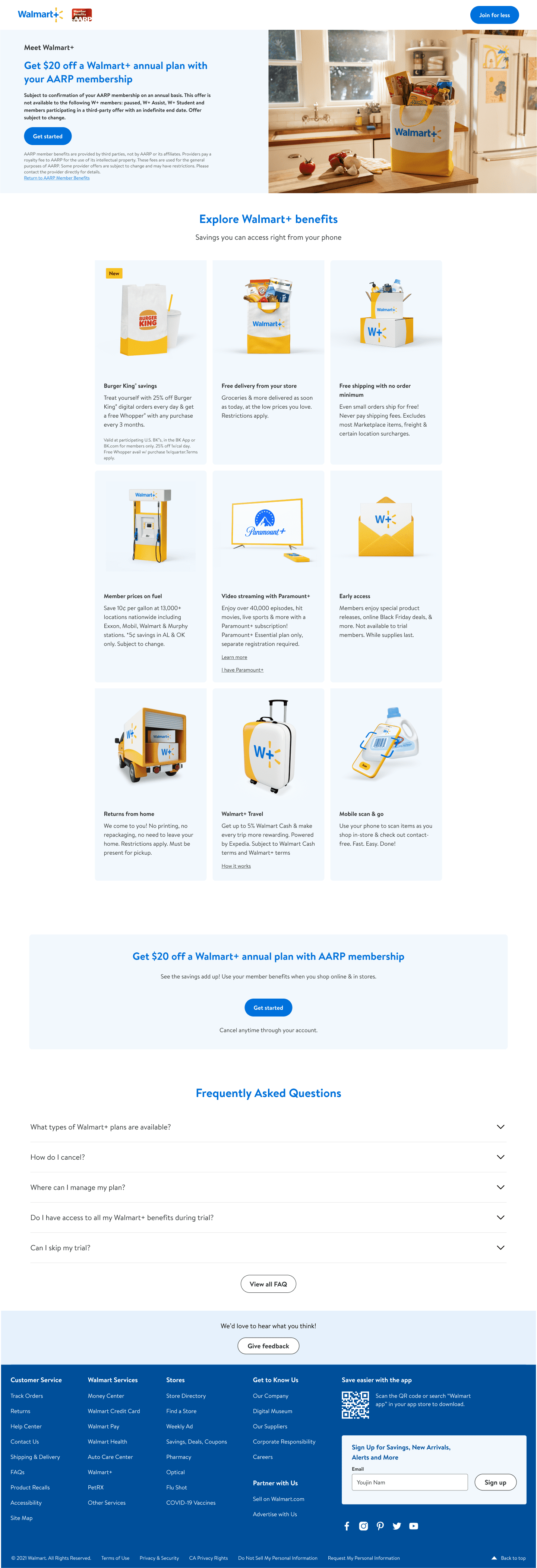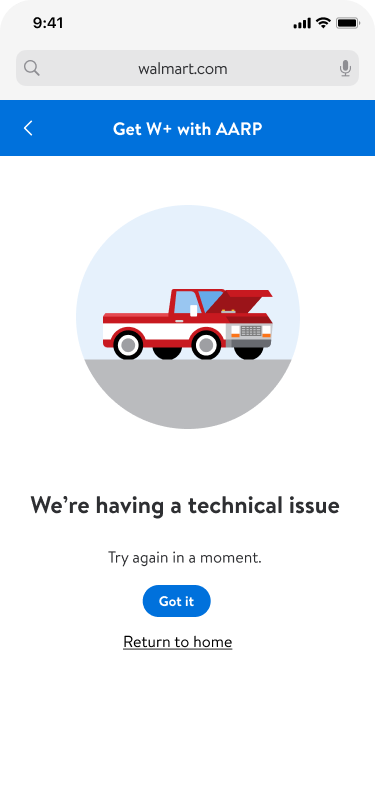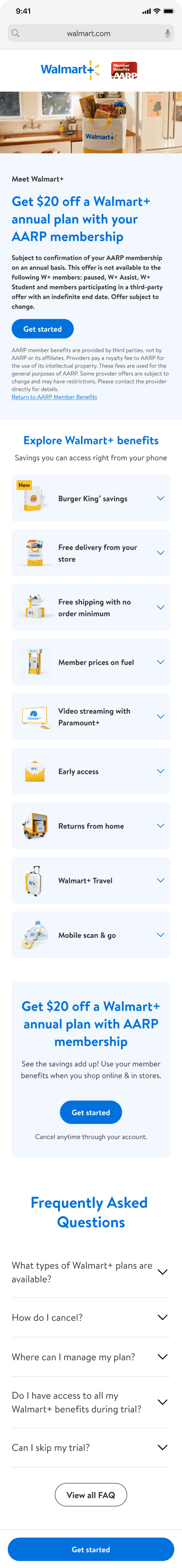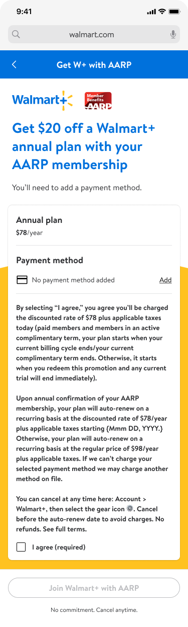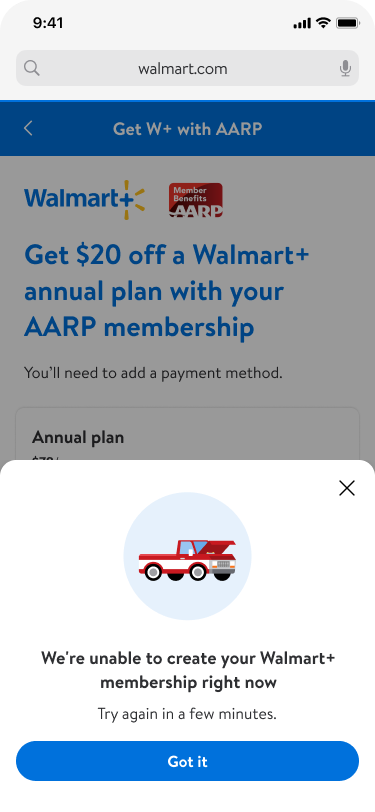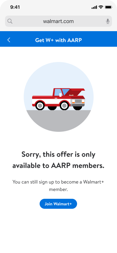 I led design of a specialized acquisition pathway for AARP members to access a discounted Walmart+ membership ($78 vs $98), then turned that work into a reusable template system covering 7 partnership types. The result: Walmart+ can now launch new member acquisition partnerships in weeks instead of months, with consistent UX across every partner.